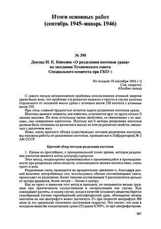 Доклад И.К. Кикоина «О разделении изотопов урана» на заседании Технического совета Специального комитета при ГКО. Не позднее 10 сентября 1945 г.