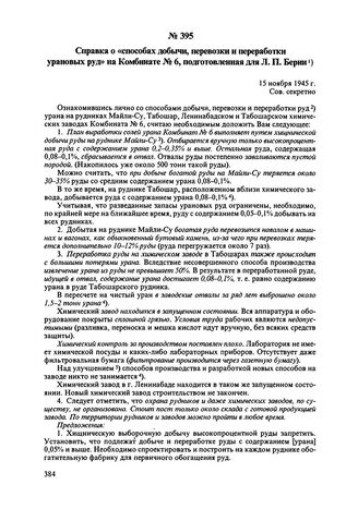 Справка о «способах добычи, перевозки и переработки урановых руд» н...