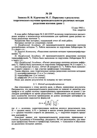 Записка И.В. Курчатова М.Г. Первухину о результатах теоретического изучения производительности различных методов разделения изотопов урана. 13 мая 1943 г.