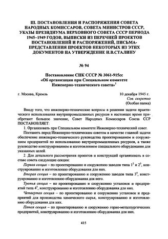 Постановление СНК СССР № 3061-915сс «Об организации при Специальном комитете Инженерно-технического совета».10 декабря 1945 г.