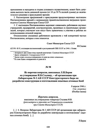 Из перечня вопросов, внесенных Л.П. Берия на утверждение И.В.Сталину, - об организации при Лаборатории № 2 АН СССР Конструкторского бюро по разработке конструкции и изготовлению опытных атомных бомб. 8 апреля 1946 г.