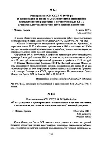 Распоряжение СМ СССР № 10755-рс об организации на заводе № 25 Министерства авиационной промышленности разработки и изготовления для КБ-11 агрегатов электроавтоматики особо высокой надежности. 14 июля 1949 г. // АП РФ. Ф. 93, коллекция постановлений и распоряжений СМ СССР за 1949 г. Копия.