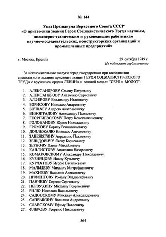 Указ Президиума Верховного Совета СССР «О присвоении звания Героя Социалистического Труда научным, инженерно-техническим и руководящим работникам научно-исследовательских, конструкторских организаций и промышленных предприятий». 29 октября 1949 г.