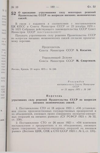 Постановление Совета Министров СССР. О признании утратившими силу некоторых решений Правительства СССР по вопросам внешних экономических связей. 21 марта 1975 г. № 240