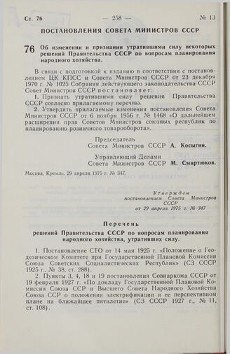 Постановление Совета Министров СССР. Об изменении и признании утратившими силу некоторых решений Правительства СССР по вопросам планирования народного хозяйства. 29 апреля 1975 г. № 347