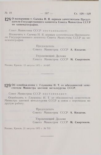 Постановление Совета Министров СССР. О назначении т. Сычева Н.Я. первым заместителем Председателя Государственного комитета Совета Министров СССР по кинематографии. 12 августа 1975 г. № 697