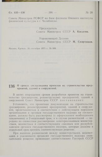 Постановление Совета Министров СССР. О сроках согласования проектов на строительство предприятий, зданий и сооружений. 18 сентября 1975 г. № 811