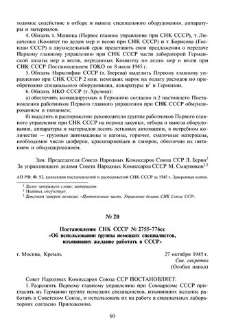 Постановление СНК СССР № 2755-776сс «Об использовании группы немецких специалистов, изъявивших желание работать в СССР». 27 октября 1945 г. // АП РФ. Ф. 93, коллекция постановлений и распоряжений СНК СССР за 1945 г. Заверенная копия.