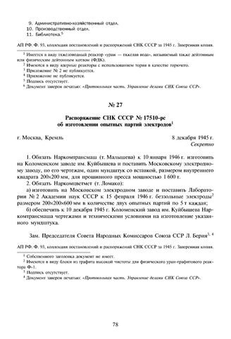 Распоряжение СНК СССР № 17510-рс об изготовлении опытных партий электродов. 8 декабря 1945 г. // АП РФ. Ф. 93, коллекция постановлений и распоряжений СНК СССР за 1945 г. Заверенная копия.