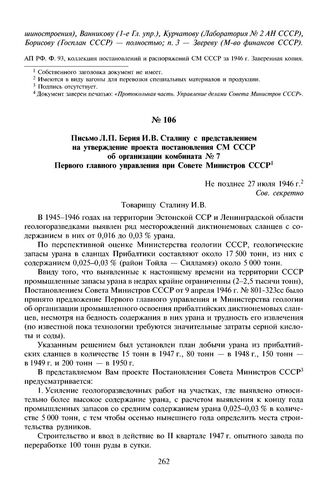 Письмо Л.П. Берия И.В. Сталину с представлением на утверждение проекта постановления СМ СССР об организации комбината № 7 Первого главного управления при Совете Министров СССР. Не позднее 27 июля 1946 г.