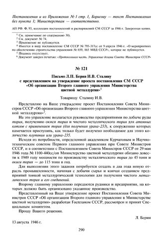 Письмо Л.П. Берия И.В. Сталину с представлением на утверждение проекта постановления СМ СССР «Об организации Второго главного управления Министерства цветной металлургии». 13 августа 1946 г.