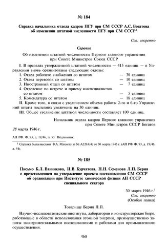 Письмо Б.Л. Ванникова, И.В. Курчатова, Н.Н. Семенова Л.П. Берия с представлением на утверждение проекта постановления СМ СССР об организации при Институте химической физики АН СССР специального сектора. 30 марта 1946 г. // АП РФ. Ф. 93, д. 131/46, л. 47-54. Подлинник.
