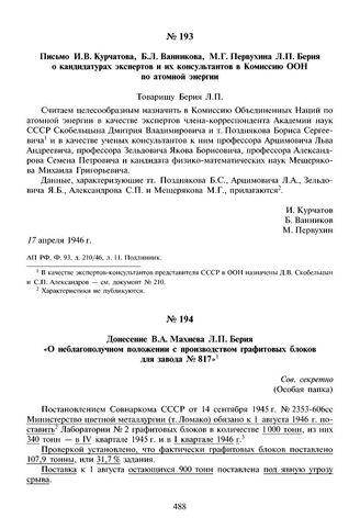 Письмо И.В. Курчатова, Б.Л. Ванникова, М.Г. Первухина Л.П. Берия о кандидатурах экспертов и их консультантов в Комиссию ООН по атомной энергии. 17 апреля 1946 г.