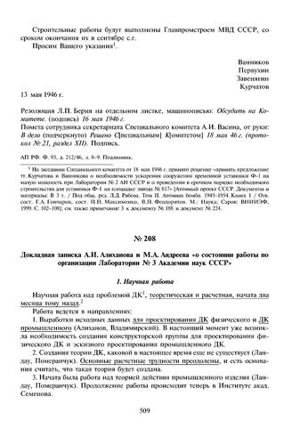 Докладная записка А.И. Алиханова и М.А. Андреева «о состоянии работы по организации Лаборатории № 3 Академии наук СССР». 15 мая 1946 г.