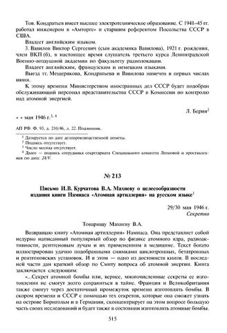Письмо И.В. Курчатова В.А. Махневу о целесообразности издания книги Намиаса «Атомная артиллерия» на русском языке. 29/30 мая 1946 г.