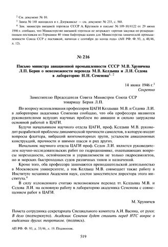 Письмо министра авиационной промышленности СССР М.В. Хруничева Л.П. Берия о невозможности перевода М.В. Келдыша и Л.И. Седова в лабораторию Н.Н. Семенова. 14 июня 1946 г. // АП РФ. Ф. 93, д. 33/46, л. 19. Подлинник.