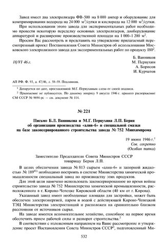Письмо Б.Л. Ванникова и М.Г. Первухина Л.П. Берия об организации производства «алив-6» и специальной смазки на базе законсервированного строительства завода № 752 Минхимпрома. 19 июня 1946 г.