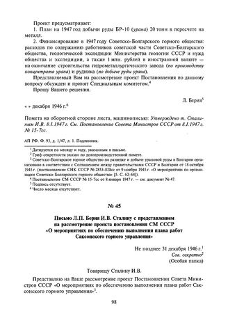 Письмо Л.П. Берия И.В. Сталину с представлением на рассмотрение проекта постановления СМ СССР «О мероприятиях по обеспечению выполнения плана работ Саксонского горного управления». Не позднее 31 декабря 1946 г.