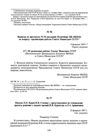 Выписка из протокола № 56 заседания Политбюро ЦК ВКП(б) по вопросу «организации работы Совета Министров СССР». 8 февраля 1947 г.