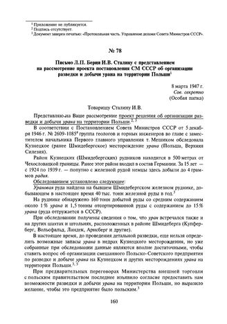 Письмо Л.П. Берия И.В. Сталину с представлением на рассмотрение проекта постановления СМ СССР об организации разведки и добычи урана на территории Польши. 8 марта 1947 г.