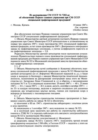 Из распоряжения СМ СССР № 7282-рс об обеспечении Первого главного управления при СМ СССР специальной графитированной продукцией. 14 июня 1947 г. // АП РФ. Ф. 93, коллекция постановлений и распоряжений СМ СССР за 1947 г. Заверенная копия.