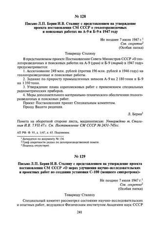 Письмо Л.П. Берия И.В. Сталину с представлением на утверждение проекта постановления СМ СССР «О мерах улучшения научно-исследовательских и проектных работ по созданию установки С-100 (мощного синхротрона)». Не позднее 7 июля 1947 г. // АП РФ. Ф. 93, д. 1/47, л. 69. Подлинник.