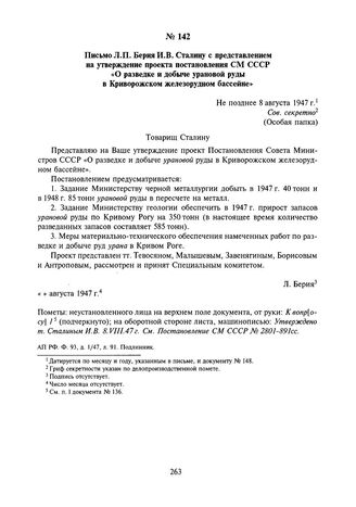 Письмо Л.П. Берия И.В. Сталину с представлением на утверждение проекта постановления СМ СССР «О разведке и добыче урановой руды в Криворожском железорудном бассейне». Не позднее 8 августа 1947 г. // АП РФ. Ф. 93, д. 1/47, л. 91. Подлинник.
