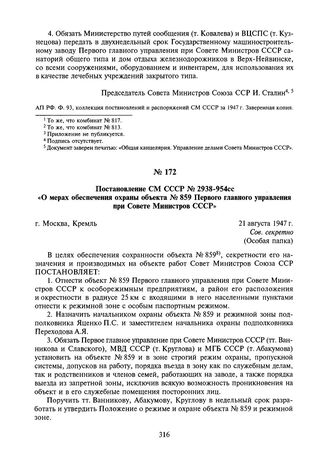 Постановление СМ СССР № 2938-954сс «О мерах обеспечения охраны объекта № 859 Первого главного управления при Совете Министров СССР». 21 августа 1947 г.