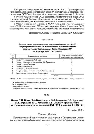 Письмо Л.П. Берия, Н.А. Вознесенского, Б.Л. Ванникова, И.В. Курчатова, М.Г. Первухина, В.А. Малышева И.В. Сталину с представлением на утверждение проектов постановлений СМ СССР и решения ЦК ВКП(б). 24 ноября 1947 г. // АП РФ. Ф. 93, д. 1/47, л. 143-144. Подлинник.