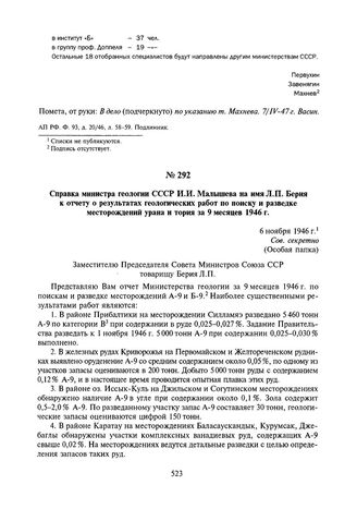 Справка министра геологии СССР И.И. Малышева на имя Л.П. Берия к отчету о результатах геологических работ по поиску и разведке месторождений урана и тория за 9 месяцев 1946 г. 6 ноября 1946 г. // АП РФ. Ф. 93, д. 45/46, л. 74-75. Подлинник.