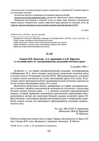 Справка И.В. Курчатова, Л.А. Арцимовича и Д.В. Ефремова «о состоянии работ по электромагнитному разделению изотопов урана». 31 декабря 1946 г.