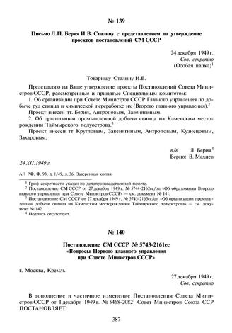 Постановление СМ СССР № 5743-2161сс «Вопросы Первого главного управления при Совете Министров СССР». 27 декабря 1949 г. // АП РФ. Ф. 93, коллекция постановлений и распоряжений СМ СССР за 1949 г. Заверенная копия.