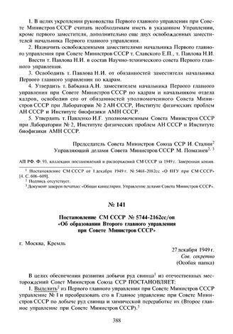 Постановление СМ СССР № 5744-2162сс/оп «Об образовании Второго главного управления при Совете Министров СССР». 27 декабря 1949 г.