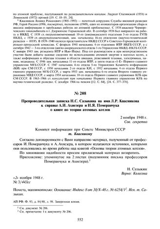 Препроводительная записка Н.С. Сазыкина на имя Л.Р. Квасникова к справке А.И. Ахиезера и И.Я. Померанчука о книге по теории атомных котлов. 2 ноября 1948 г. // АП РФ. Ф. 93, д. 84/48, л. 98. Заверенная копия.