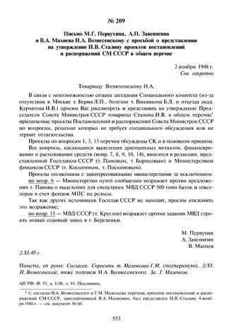 Письмо М.Г. Первухина, А.П. Завенягина и В.А. Махнева Н.А. Вознесенскому с просьбой о представлении на утверждение И.В. Сталину проектов постановлений и распоряжений СМ СССР в общем перечне. 2 ноября 1948 г. // АП РФ. Ф. 93, д. 1/48, л. 81. Подлинник.