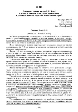 Докладные записки на имя Л.П. Берия о котлах с тяжелой водой, плане производства и стоимости тяжелой воды и об использовании тория. 4 ноября 1948 г.