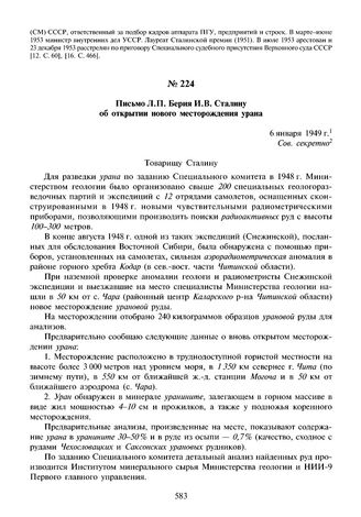 Письмо Л.П. Берия И.В. Сталину об открытии нового месторождения урана. 6 января 1949 г. // АП РФ. Ф. 93, д. 1/49, л. 5-6. Заверенная копия.