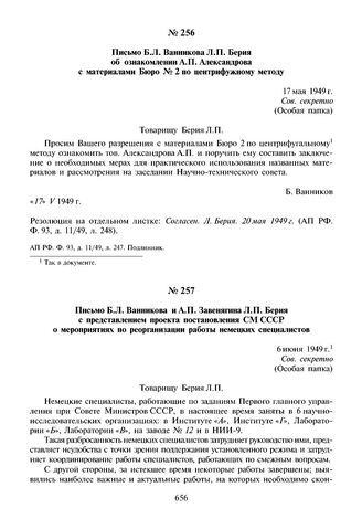 Письмо Б.Л. Ванникова Л.П. Берия об ознакомлении А.П. Александрова с материалами Бюро № 2 по центрифужному методу. 17 мая 1949 г.