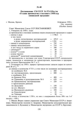 Постановление СМ СССР № 573-219сс/оп «О плане производства и поставки в 1950 году специальной продукции». 14 февраля 1950 г.