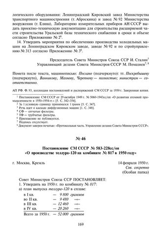 Постановление СМ СССР № 583-228сс/оп «О производстве теллура-120 на комбинате № 817 в 1950 году». 14 февраля 1950 г. // АП РФ. Ф. 93, коллекция постановлений и распоряжений СМ СССР за 1950 г. Заверенная копия.