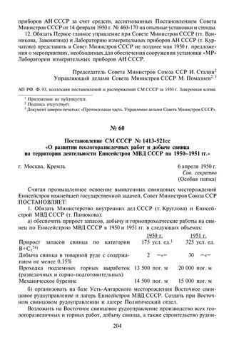 Постановление СМ СССР № 1413-521сс «О развитии геологоразведочных работ и добыче свинца на территории деятельности Енисейстроя МВД СССР на 1950-1951 гг.». 6 апреля 1950 г. // АП РФ. Ф. 93, коллекция постановлений и распоряжений СМ СССР за 1950 г. Заверенная копия.