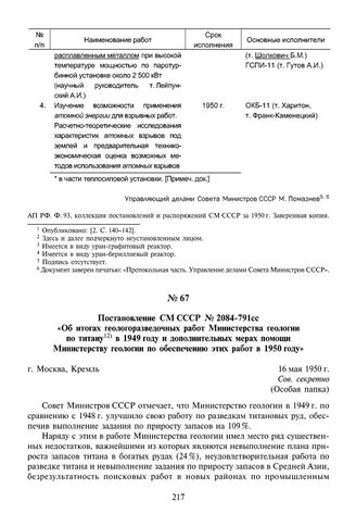 Постановление СМ СССР № 2084-791сс «Об итогах геологоразведочных работ Министерства геологии по титану в 1949 году и дополнительных мерах помощи Министерству геологии по обеспечению этих работ в 1950 году». 16 мая 1950 г.