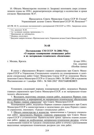 Постановление СМ СССР № 2086-793сс «О порядке планирования специальных работ и их материально-технического обеспечения». 16 мая 1950 г. // АП РФ. Ф. 93, коллекция постановлений и распоряжений СМ СССР за 1950 г. Заверенная копия.