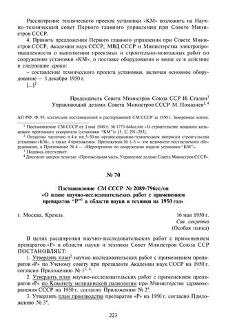 Постановление СМ СССР № 2089-796сс/оп «О плане научно-исследовательских работ с применением препаратов “Р” в области науки и техники на 1950 год». 16 мая 1950 г. // АП РФ. Ф. 93, коллекция постановлений и распоряжений СМ СССР за 1950 г. Заверенная копия.