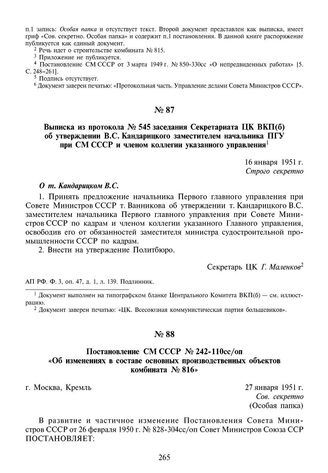 Выписка из протокола № 545 заседания Секретариата ЦК ВКП(б) об утверждении В.С. Кандарицкого заместителем начальника ПГУ при СМ СССР и членом коллегии указанного управления. 16 января 1951 г.