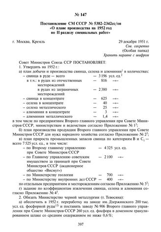 Постановление СМ СССР № 5382-2342сс/оп «О плане производства на 1952 год по II разделу специальных работ». 29 декабря 1951 г.