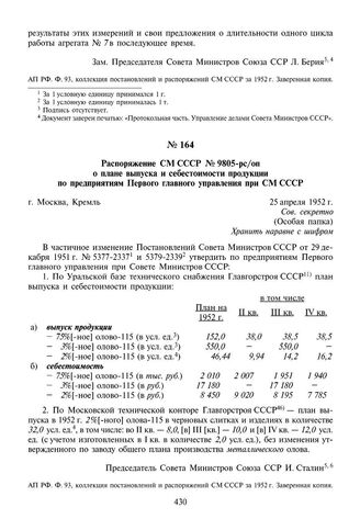 Распоряжение СМ СССР № 9805-рс/оп о плане выпуска и себестоимости продукции по предприятиям Первого главного управления при СМ СССР. 25 апреля 1952 г. // АП РФ. Ф. 93, коллекции постановлений и распоряжений СМ СССР за 1952 г. Заверенная копия.