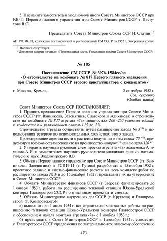 Постановление СМ СССР № 3976-1584сс/оп «О строительстве на комбинате № 817 Первого главного управления при Совете Министров СССР второго кристаллизатора с конденсатом». 2 сентября 1952 г.
