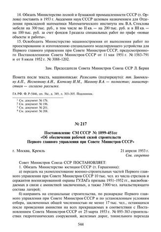 Постановление СМ СССР № 1099-451сс «Об обеспечении рабочей силой строительств Первого главного управления при Совете Министров СССР». 21 апреля 1953 г. // АП РФ. Ф. 93, коллекция постановлений и распоряжений СМ СССР за 1953 г. Заверенная копия.