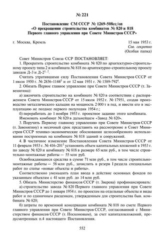 Постановление СМ СССР № 1269-508сс/оп «О прекращении строительства комбинатов № 820 и 818 Первого главного управления при Совете Министров СССР». 15 мая 1953 г.
